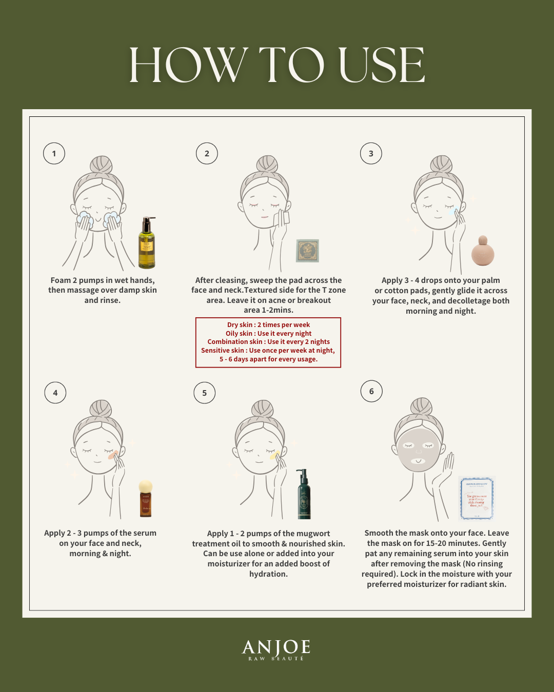 3. Smooth the mask onto your face. For added hydration, apply 1-2 drops of Mugwort Treatment Oil before applying the mask.